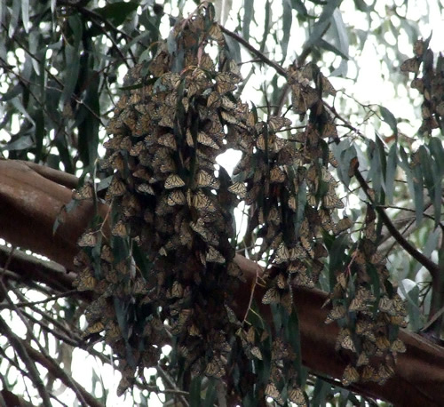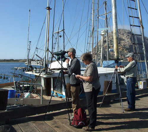 We seem to be unstable these days. We decided to leave Morro Strand RV Park after our week was up and give this place a try. Took Clemmie for a warmup to San Louis Obispo and back, then settled in here last Monday, great location, only 2 blocks from the center of town. Alas, a much shorter walk to the French Bakery. Bill embarked on an 8-day clean-out fast on Tuesday while Pat succumbed to the bakery's lure, treats for her writing effort. Payback time is nearing, waist fittings are tight. Thursday we went to the Pismo Beach butterfly sanctuary to see the Monarchs roosting and while there we hooked up with Georgia and Dick, friends from our Mexico trip. Dick is a butterfly expert and gives talks at the sanctuary. We ate lunch at their house in nearby Arroyo Grande afterwards, very nice to re-connect. Last night Pat went to the Morro Bay Audubon's 40th anniversary celebration while Bill went to a guitar/cello concert. This morning Pat took a day off from writing to participate in a Pacific Coast shorebird count. With Georgia, Dick and another local birder they turned up a goodly list in their assigned area. It was a glorious day; 8 eyes (+ scope) noticed a lot more birds hanging around than Pat had found on her own. We're getting to like Morro Bay, moderate temperatures (60-70 daytime, round 50 at night), great biking, hiking, and birding, and wonderful coastal views. We leave Wednesday for Death Valley, but we'll be back next year we think.