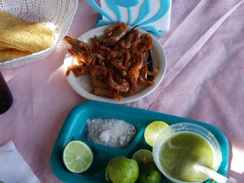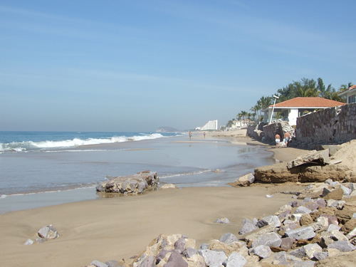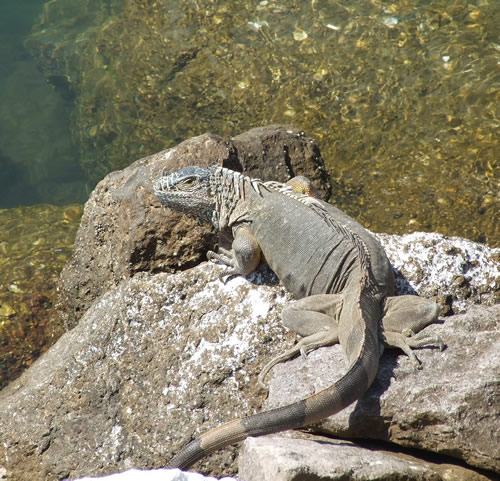 We bade Tepic farewell soon after first light on Tuesday, and made our way north back to this RV Park. We took the cuota (toll road) where it was available. Some of it is brand new, some still under construction, most of the way 2-lane roads. Some of the surface excellent, some bumpy bumpy. The usual mix we've come to expect. Our 191 mile trip took almost 6 hours with all of the stops that arose. We're looking forward to being on our own, able to pick and choose our stopping points. No complaints, though, the Caravan has been a good experience. Weather here lovely, a cool sea breeze mitigating the mid-80's sunshine. Walked on the beach (disappearing due to erosion) as are some of the houses facing right onto it. Regardless, there's a massive construction boom of beach front condos underway. We figured they'll be swallowed up by hurricane damage, erosion, and rising tides before the financing is paid off. Walked around the Mazatlan marina and felt nostalgic looking at all the sailboats. Then diverted by the huge iguanas sunning themselves on the rocks lining the marina basin. This is a handy campground: all kinds of services are available. Daily vegetable truck, laundry pickup and delivery, water and propane deliveries, haircuts, massage, manicure, vehicle wash, and fresh shrimp deliveries. We got Clemmie washed and polished, bought water and veggies, had our laundry done, and filled the freezer with shrimp. Enjoyed eating at the little street restaurant just outside the campground gates.