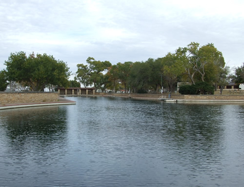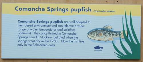Temperature last night rose near 30°F, things are looking up. Nothing drew us to linger in El Paso, so we filled up the propane tank (the heater has been working overtime) and drove back onto I-10 going east, leaving El Paso unexplored behind. Through a border inspection checkpoint. Gave up any thoughts we had about swinging by Alpine and Big Bend. The cold discourages lingering, we just want to make time on the highway. After checking our resources, we decided to stop here for the night, a few miles off the interstate in the middle of nowhere. The Davis Mountains to the south and high plains to the east. We arrived at 1pm, found the place largely deserted, and settled in, though a few more travellers trickled in later. It's a sweet place, with a huge swimming pool fed by hot springs, a million gallons per hour at a steady 74°F. Had the air temperature risen above 45°, we might have gone swimming. The pool runs from 3' - 30' deep, and teems with endangered little fish, happy to swim with people. A flock of scaup had taken up residence at one end.