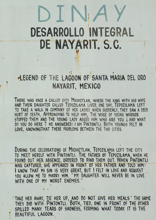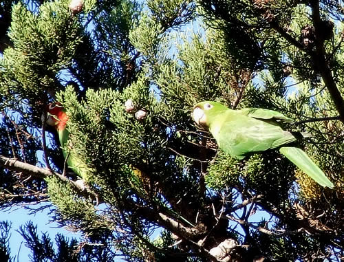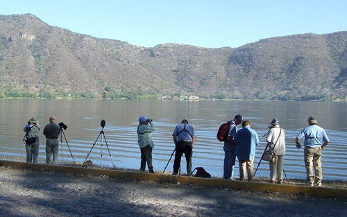 Saturday the entire group, including non-birders, drove 30 miles or so to a crater lake, Laguna Santa Maria del Oro. Beautiful place. Good birding, nice restaurant. Interesting legend about the formation of the lake. Sunday, had a nice walk along the boulevard towards the city center, found the visitor's center and learned about historic places to see. Right now we're more interested in Mexico and its culture than the birds. There are few gringos in Tepic so the culture is intact. In the afternoon we car pooled about 15 miles to an overlook on the Tepic-Mazatlan Libre (old highway, a free road as opposed to the Cuota.) A windy narrow road through the hills, heavy with overloaded truck traffic. The usual sprinkling of crosses at corners memorializing head-on collisions or a failure to make a turn. At one corner, a bunch of people were harvesting from a carpet of tomatoes spilt from some unfortunate truck. At the overlook (El Mirador de Aguila) we hung around for 30 minutes until a flock of Military Macaws showed up below, we counted 17 together at one point. Incredible striking birds, only a few thousand remain scattered among their fragmented habitats from Mexico to Argentine. Their decline is due to capture for sale as pets and loss of habitat.