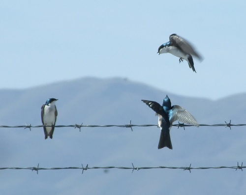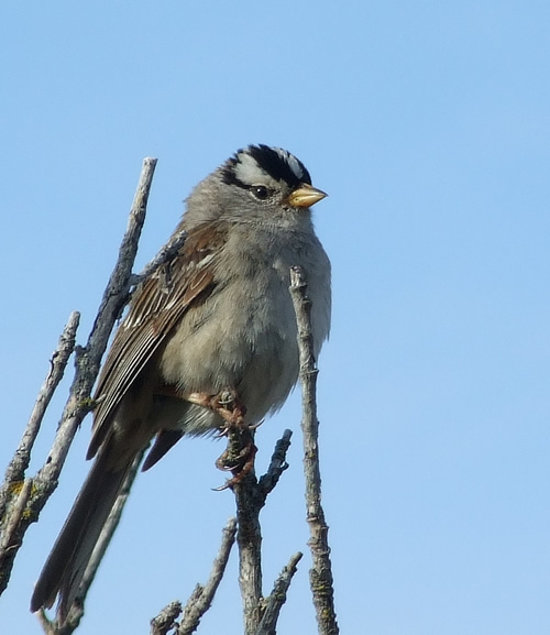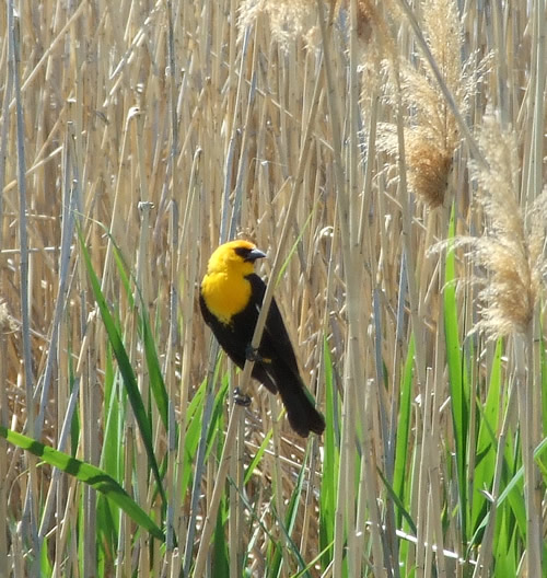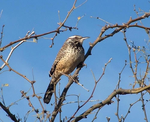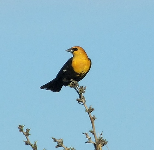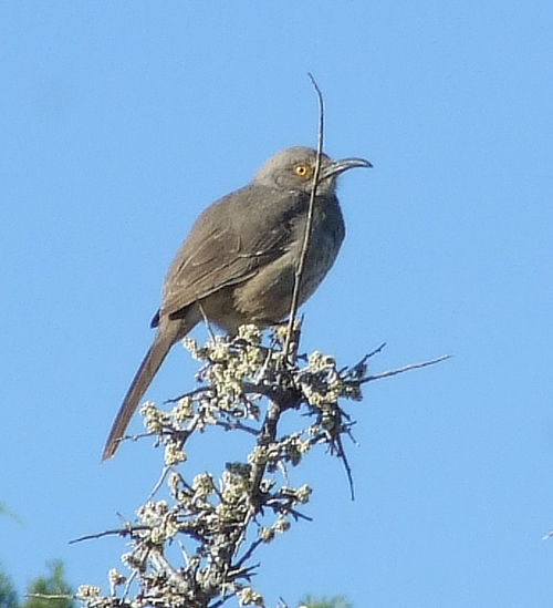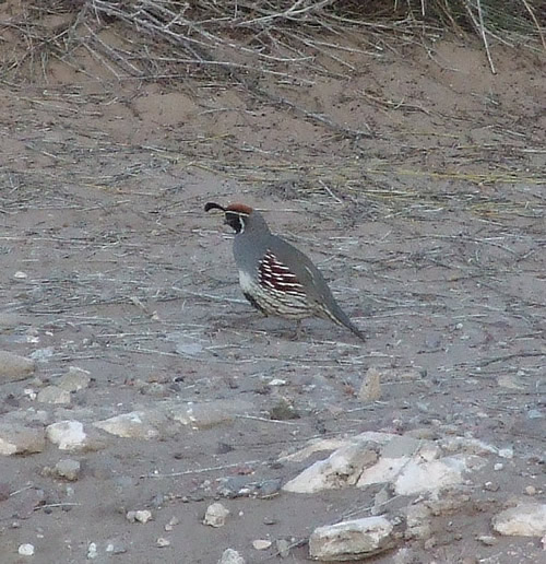 Left Catalina at first light yesterday, dumped the tanks and drove south through Tucson to I-10, then east into New Mexico. At Deming, we took Rte 26 to cut a corner and reach north-bound I-25. Made short detours to look at Percha Dam and Caballo Lake State Parks but decided to continue onwards to this third of that state park group along the dammed waters of the Rio Grande.We were glad we had, it's a beautiful spot. 378 miles. A cool night (we've risen to 4,500') brought another clear day and pleasant walks along the lakeside. While there's not great variety of birds here, there are plenty of them. We snagged photos of a Gambill's Quail, Curve-billed Thrasher, and a Yellow-headed Blackbird. You can see them our continually expanding Bird Pages of the Photo Album.