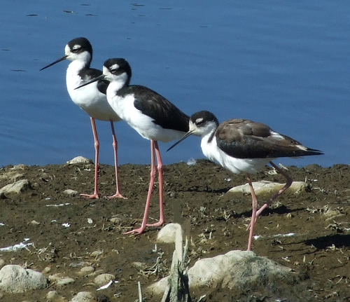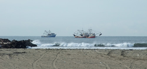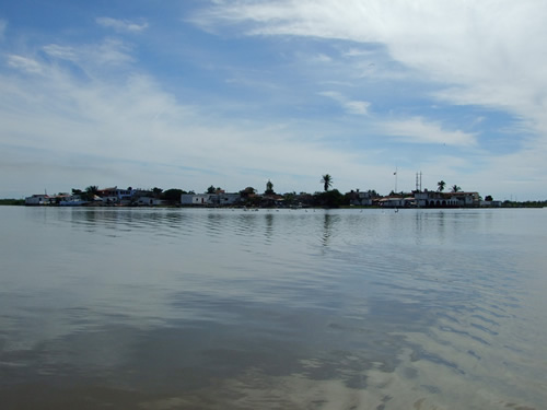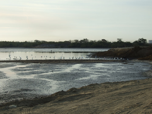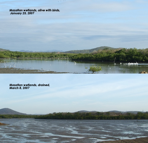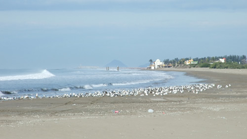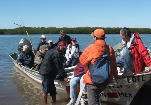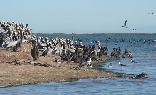 Thankfully, the rain quit Friday night, Saturday overcast but dry, and Sunday and today sunny. Great place with very tired but still serviceable baños (bathrooms) and shower. Shrimp dinner at the hotel's outdoor restaurant one night, and pleasant group happy hours (planned or ad hoc) other evenings. Terrific birding Saturday on the beach and nearby dunes and scrub. Great walking. Sunday, Pat went on a boat trip through the mangroves with most of the others, while Bill and one other stayed home to chill out and practice guitar. An incredible boat trip in an open ponga through miles and miles of mangroves bordering the channel between the mainland and Isla Macapule. Nothing like this left in the US. Herons and egrets roosting, pelicans fishing, all along the route towards Bahia De Vinorama, then ashore on Bird Island. Thousands of sea and shore birds calling, roosting, nesting, and foraging. A bird density we've only seen once before, at Cape St. Mary's in Newfoundland. Unforgettable. Monday, a mostly car-birding trip around the (dry) shrimp ponds and beach near the village to watch the frigate birds and gulls swarming over the fishing boats.
