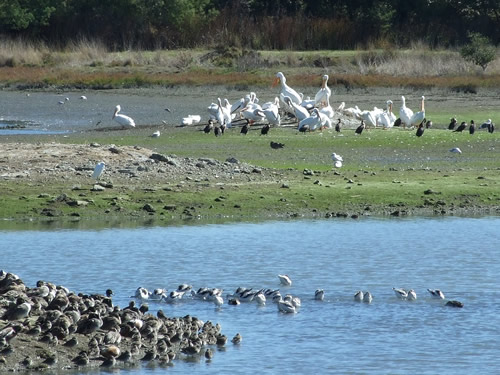 After a quick stop at the RV Coral in Eugene last Wednesday morning for some minor maintenance to Clemmie, we got back onto I-5 and headed south. Oscillating drizzle and rain curtained the beautiful southern Oregon scenery. A scenic drive in good weather. Truck heaven, though. Clear evidence of the stuff machine at work in the US culture. Goods and packaging wheeling hither and thither, to malls, to consumers, then to the garbage dump. Around 6pm we pulled into a Flying J truck stop (they're RV friendly) near Corning, CA for the night. Left early Thursday and continued south on I-5 to I-505, then I-80 west to Rte 37 through Vallejo along the north side of San Pablo Bay. Then south on Rte 101 through San Rafael to this campground in time for lunch. 551 miles from Eugene. Some improvements here since our visit last November: New office and laundry, and free WiFi. A remarkable place, wedged between the Corte Madera wetlands and the freeway (Rte 101). Walk to all kinds of shopping, great bike paths, and near the Larkspur ferry terminal for the fast catamaran across the bay to San Francisco. The wetlands are a bird and birder heaven. The birds are inured to freeway and people noise and for the most part birds and humans ignore each other. A quick walk in the wetlands after we settled into our campsite yielded 31 species.