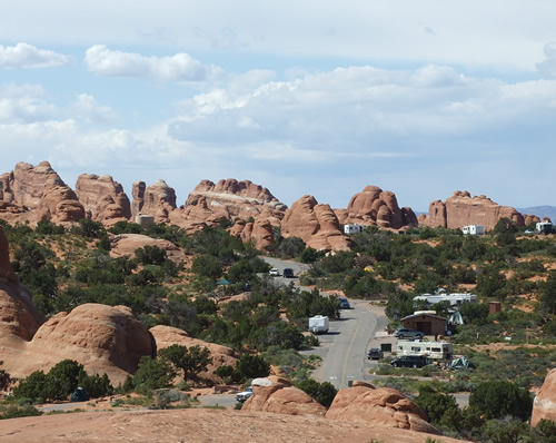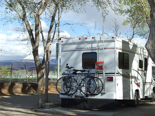 Monday a week ago we decided that the weather outlook for the Grand Canyon was too cold for our tastes, so bagged Plan A in favor of Plan B. Ergo... We said goodby to Steve early a week ago today and drove west on I-40 to Gallup, then north on Rte 491 through the barren southwest corner of Colorado into Utah. Terrific winds buffeting traffic all the way. At Monticello we joined Rte 191 and started to see some of the amazing rock formations in this part of the country. Arrived in Moab around 4:00pm. It's a pretty small town right in the canyonlands area, very near two national and one state park, all renowned for their scenery. 391 miles. Our campground is downtown, adjacent to the school track and playing fields. We can watch sports activities from Clemmie, as well as canyon walls and the distant Rockies. Great place, nice town, good biking and hiking, plenty of natural beauty, free WiFi, and good bathrooms. Not much bird life though. Chilly days at first, a few thunderstorms, but warmer now. Saturday we biked into the canyonlands, along the beautiful Colorado River. Today we're going to Canyonlands National Park (the Island in the Sky) and Dead Horse Point State Park to look at the vistas. Hopefully we'll come back with a bag of good pix. We'll stay here for another week, we're enjoying just "being at home" doing our thing. Which consists of guitar and recorder work, writing project and website stuff for Pat (maps are all done), Bill's current study tome (Leon Pomeroy's The New Science of Axiological Psychology), getting a decent amount of exercise (the track round the playing fields next door to the campground is great), and watching the News Hour with Jim Lehrer on our teeny (5" by 8") TV, among other daily activities.