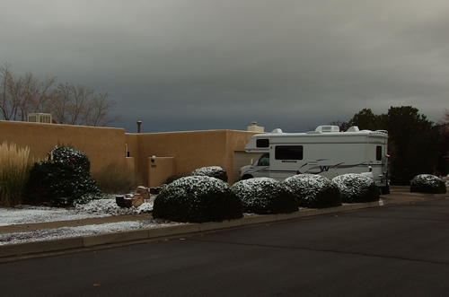 After leaving Las Vegas we drove south towards Lake Meade on Rte 93 and then to the Hoover Dam. Spectacular. The Lake above the dam shows the effects of drought. The highway is being re-routed so it will have its own bridge instead of running over the dam. RV's are allowed to cross the dam but must be open to inspection. [Homeland Security.] The Rte 93 re-routing is a humungous engineering project. After a few hours here, we drove on and eventually stopped for the night at a Flying J (RV friendly) truck stop in Winslow, AZ. We arrived here mid-day Tuesday to celebrate Bill's 72nd birthday. Since then Pat focused on finishing her 50,000 word National Novel Writing Month challenge a week ahead of schedule, who knows what the rest of the month will hold. Glad she made a big push at the beginning of the month, the second half has been toast as far as writing time went. We had planned to leave today to see the Sandhill Cranes at Bosque Del Apache National Wildlife Refuge, but changed our minds and hunkered down for one more day to let the snow/weather clear in the southern part of the state. This frigid arctic front arrived in Albuquerque soon after we did, steam-rollering its slow way across the southwest. Cooked turkey for Thanksgiving. Ate left overs. And more left overs. Last night plunged to 19°F, a record low for us sleeping in Clemmie. We managed, but wouldn't voluntarily choose it again. Thank goodness for body heat.