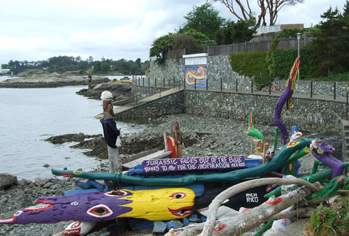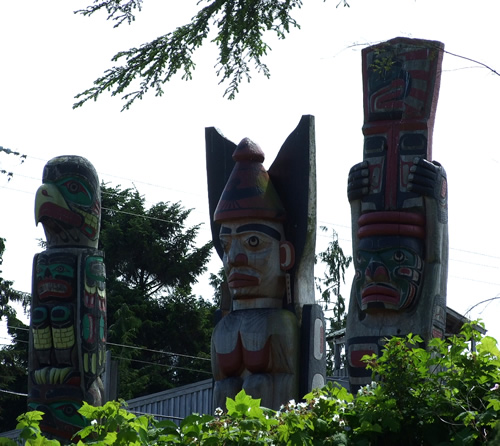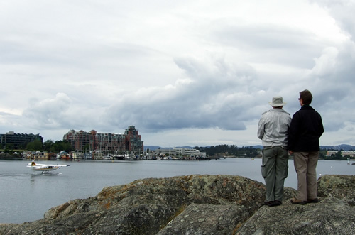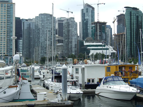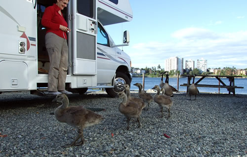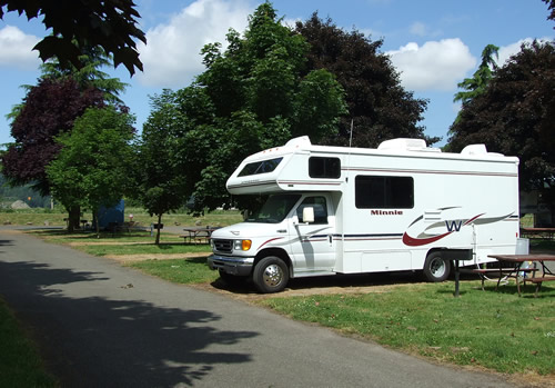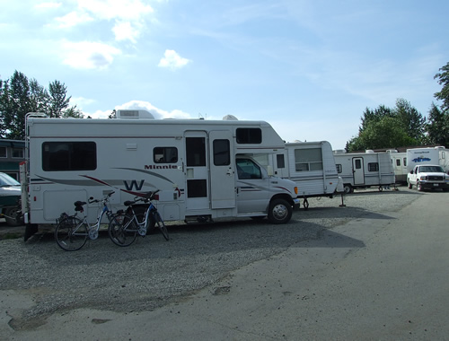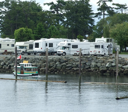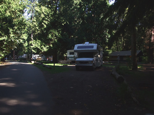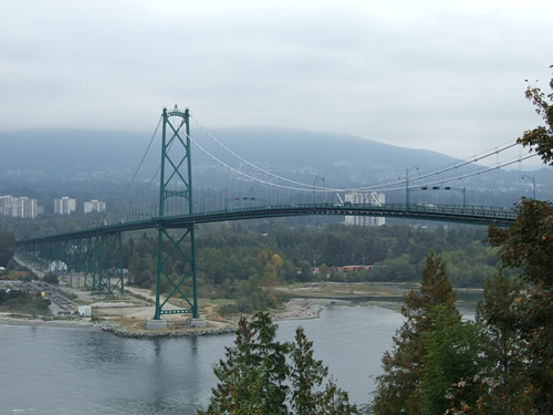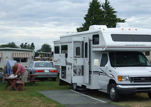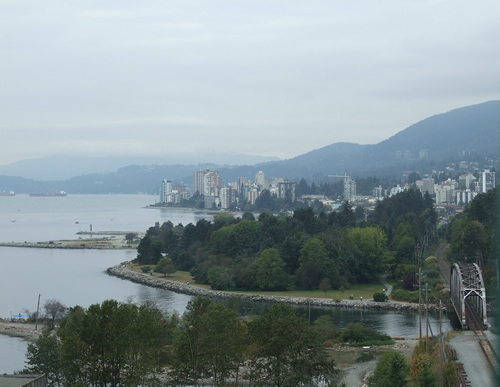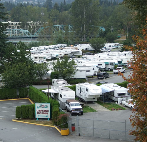 Yesterday morning we left our campsite at Birch Bay State Park just after 7am, dumped, and drove south on I-5 back to Bellingham. An ad for Al's RV Parts and Services in the campground brochure had led us to call and arrange for installation of a replacement kitchen faucet. Our 3 weeks with no spiggot has been an inconvenience, not a disaster. While waiting at Al's, we passed time in conversation with violinist Swil Kanim and his wife, interesting people. He makes different music. Once the faucet installation was done (about an hour) we drove from Bellingham north on I-5 to Canada and an easy border crossing. Then north on BC Rte 15 through Surrey to the Trans Canada Highway (Rte 1) and across the north edge of Vancouver to this busy RV Park on the edge of West Vancouver. Arrived around 11:30am, 6th in line. Glad we had a reservation. In the afternoon we walked to the nearby mammoth Park Royal shopping mall to people watch and be amazed by the amout of stuff we don't need. Yesterday, we walked across the Lion's Gate Bridge into Stanley Park, took the park shuttle to the edge of downtown, walked along the seawall past Coal Harbour into the center of Vancouver, collected public transit information, and took a bus back home. We're here for a while; on Wednesday, Pat takes the ferry to Nanaimo (Vancouver Island) to spend a week in Courtenay with her old high-school friend, Marian. Bill will practice guitar and see the sights.