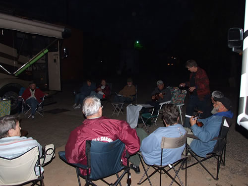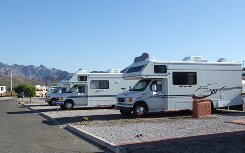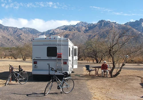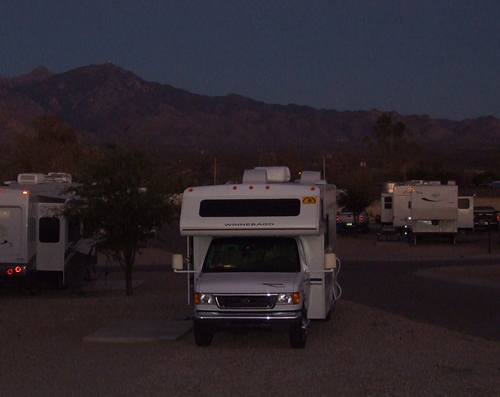 Up early yesterday at Catalina State Park to another cold morning. Headed down Rte 77 to the southern side of Tucson for an early stop at the Tire Center, truck and RV specialists. Learned a lot about RV/truck tires. Replaced our puny tire stems with muscular metal ones, and truck-worthy extensions that now bring the nipple outside the hub caps. A good stop. Decided that we should go to truck tire outfits to get the tires rotated or alignment checked in the future. Then south on I-10 to I-19 to little town of Amado and this RV park. 54 miles. We settled into our assigned campsite adjacent to Pat and Terry Sissons, the leader of our 8-vehicle RV troup which will bird watch together in Western Mexico. This trip is under the auspices of Adventure Caravans, through whom you can reach us in case of emergencies while we're in Mexico. We spent the afternoon doing preliminaries with Pat and Terry, and just enjoying being. Nice and sunny. This morning, an overnight low of 24°F - we're awfully tired of the cold. Our plan for warm winters hasn't worked very well so far.... For the next two days we'll be busy getting to know our companion birders, and getting organized and provisioned for the border crossing early Wednesday morning.