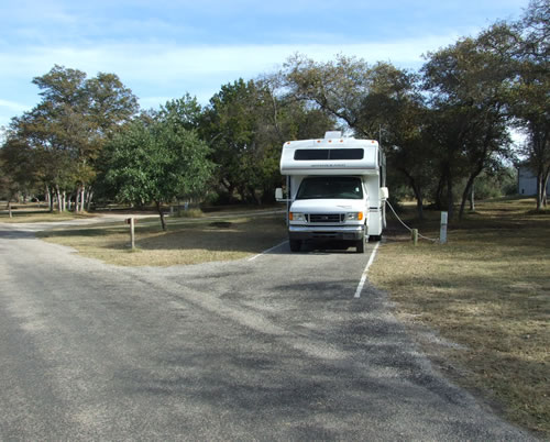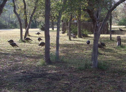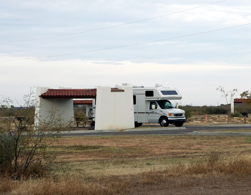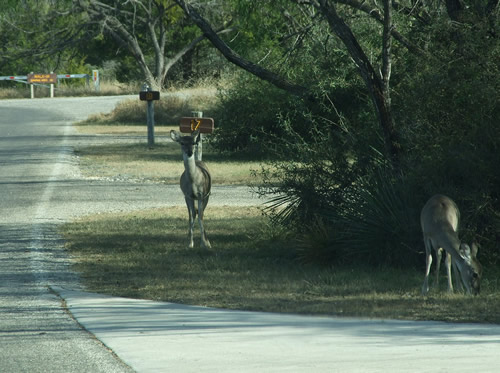 Last night 29°, we don't seem to be making much headway towards warmer weather. The forecast has been teasing unmercifully with tantalizing promises of heat which fails to materialize. We upped and left Balmorhea at 6:30, thinking we'd made an early start. Only later realized that we crossed into the Central Time Zone yesterday, so not as early as we thought. Stopped in Fort Stockton, looked all over for a breakfast place before finding an IHop. Glad we decided to stop at Balmorhea last night and not continue to that middle-of-nowhere town. To be kind, it is an unqualified dump. By breakfast, Bill was beginning to feel under the weather and slowly subsided into the agonies of what must have been food poisoning for the remainder of our day's travels. Suspicion fell on some elderly smoked salmon he ate for lunch yesterday. Beats us why it took so long to erupt, however. He was quite the basket case, exploding at both ends - fortunately timing his discharges to match the arrival of rest areas as Pat drove. There's a lot of in between in Texas, nearly as much as Alaska. High wind across the plains, windmills on the mesas, a few oil crickets leisurely pumping the dregs of the fields. We left the Interstate highway at the town of Junction and drove a few miles to this lovely state park, arriving a bit before 3pm, Central Time. 267 miles. Place is nearly deserted, many more deer and turkeys than people, but a great spot for Bill to recuperate. Our campsite not quite level, but the bathroom is heated! This lifestyle does make us notice what we otherwise used to take for granted: level floors, warm bathrooms, electricity at the drop of a switch, water at the turn of a spigot. By the end of today Bill had retrieved his old self, thank goodness. It's still cold - 32 last night and barely 60 today.