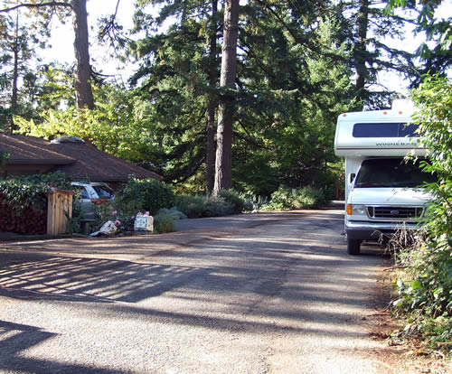 Left Portland in the fog on Friday morning early. South on Pacific Highway (Rte 99W) through little towns and farmland. Couldn't see much of it through the mist, however. Stopped in Junction City at Guaranty RV Center to browse Class B motorhomes. Liked the Pleasureways. Not that we're ready to trade in Clemmie, but as we think through what our life is going to be like next, we're researching all possibilities. For now, we're going to try out being snowbirds, in Clemmie, on the Texas Gulf coast this winter (? a possible side trip to Mexico), next spring/summer visiting dear ones in the east/northeast, and closing the circumnavigation loop in the Pacific northwest next fall. After that we think it'll be spring/summers in our house in Juneau (room for visitors) and the cold months in Texas or Mexico. Stay tuned. But you can tell our heads are moving into transition. Arrived here just after lunch. 117 miles. Good times in Eugene (a terrific small city) with Paul and Jane, helped Paul get going with a website for their house in Mexico (we'll add the link once it's "up".) Enjoyed being surrounded by Jane's art work. Pat sneezed a lot by cuddling Poco. Some nice warm days, visited nearby wineries, watched a flock of Cedar Waxwings sitting like buds atop a tall tree. Had routine maintenance checks done for Clemmie - at 45,000 miles her engine and chassis were due for a big checkup. Teplacement rear brake linings. So far, she's holding up well. Kendall Auto in College Grove (south of Eugene about 15 miles) and the RV Coral (in Eugene) are good places for RV engine and coach work respectively.