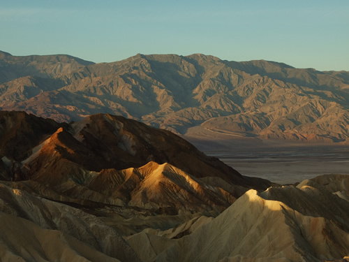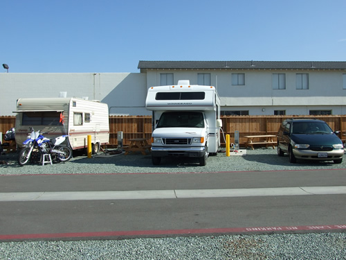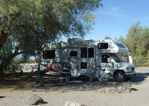 It was a long drive from Morro Bay to get to Death Valley. 351 miles. From Morro Bay we drove NE on Rte 41, high winds through the canyon. Very hazy. Calm by the time we reached Atascadero, then windy again through the hills. Rte 46 took us to I-5, then south skirting Bakersfield and then East on Rte 58. Then north on Rte 14 on the west side of Death Valley. At Olancha we filled up with gas and turned east on Rte 190 into the National Park. It's a challenging road this in from the west, steep and twisty grades, not a good place to go with a big rig or on a hot day. It was dusk as we made our first descent into Panamint Valley, and dark when we arrived at Stovepipe Wells. We spent 4 days camped here in Death Valley. Took lots of pictures of this interesting and desolate place. You can see some pix on a page of photos in the Photo Album, and a slide show is under development. We did two days of sight seeing, using Clemmie as a car to get round the accessible parts of this huge National Park. Webmaster has decided not to put all the links into a description of our doings, but rather asks you to visit our photos in the Photo Album or the slide show.