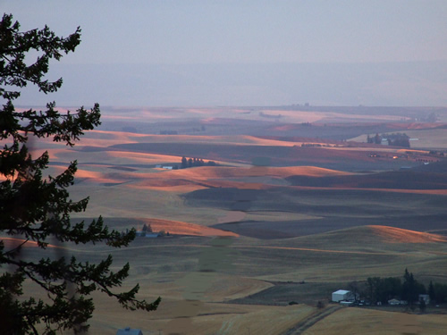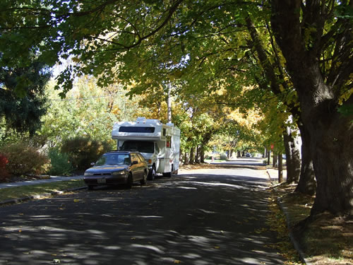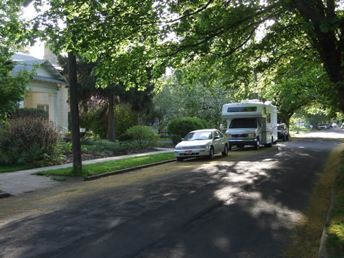 Departed Moscow in the dark yesterday morning. Stopped to buy coffee, then south on Rte 95 over the hill to Lewiston. Crossed the Clearwater and Snake rivers and found fast-food breakfast in Clarkston. Followed Rte 12 along the Snake River canyon (lovely) as the light broke. Through Walla Walla and south to the border and onto I-84 along the Columbia River to Portland. A terrific thunderstorm (and slow traffic) as we reached I-205 to go south on the east side of the city. A short cut across to Tualatin, and arrived here a bit before 3pm. 396 miles. We like this RV Park, it has an appealing ambience, good facilities, and on the bus route to downtown. Did 2 loads of laundry as the sun came out. This morning, we caught the bus (#12) for the 50 minute ride to the city center. A great deal for seniors (85¢). Took 2 heavy bags of books to Powell's, then spent several hours in that terrific bookstore (trading all our credit) and wandering round downtown. Another easy bus ride home for supper. We like figuring out public transit systems - definitely don't wish we towed a car. Nothing but stress.