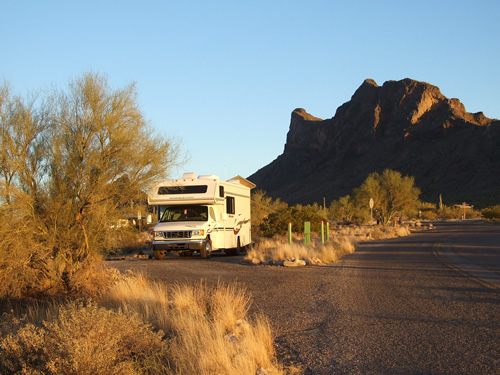 Hauled out of Beaudry's near 8:00am yesterday, filled up with propane, and headed through Tucson north on I-10. Out into the desert to find this rocky island in its midst. 56 miles. Lovely campground, great big sites and facilities and plenty of good hikes. Arizona state parks are certainly among the best. Wouldn't want to stay here in the summer, though, since average temperatures then are well over 100.° It being hot, after we settled in we did a short hike and then hung out at home, keeping an eye on busy I-10. At this distance it looked like some of the leaf-cutter ant highways we saw in Mexico, shallow grooves in the dirt with lanes of ants travelling to- and fro- seemingly full of purpose. Below the conscious level is human behavior not unlike that of ants? Guided by instinct (ants) or emotion (humans) busily going about daily life oblivious to the grand scheme of things. Seems like the main difference is we can rationalize our behavior, the ants can't. Cooler today, we're hoping for rain so we can see the desert burst into flower.
