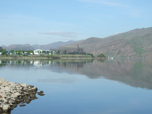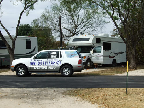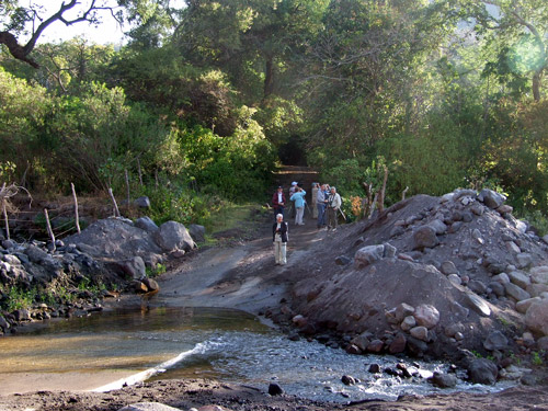last Friday, a large Christian contingent arrived in buses for the weekend. They filled up the hotel's 4 bedrooms, 5 cabins and overflowed into tents. The group configured the large open area adjacent to the RV campground as an outdoor chapel wired for surround-sound. Cermonies, preaching, singing and dancing filled the airwaves with well-amplified noise. The woofers kept us awake until the wee hours for 2 nights. We were happy not to be parked right next to the activities, as were the big rigs. A mysterious power outage somewhat dampened the audio volume for a while early Sunday morning. (We didn't do it - even if we thought about it. ) After a more muted day including ritual baptisms in the swimming pool, the noise vanished with the buses on Sunday afternoon. Quite an experience. We hoped they had a good time.