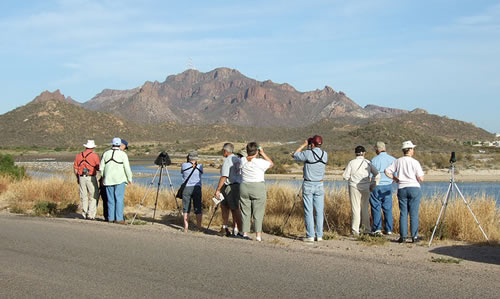Pat and Terry, our wagon masters, led the way calling frequently on the CB to note birds, scenic points, and warn of traffic hazards ahead. Took the bypass round Hermosillo and continued south on Rte 15 D making several stops for fuel, lunch, and breaks. Turned west just north of Guyamas through San Carlos to this ritzy RV park in a gorgeous setting near bays and a marina. Picked a spot with a great view. Much construction going on, the gringos have found the place. It's spectacularly beautiful. Thursday morning 61°. Happily put away the extra blanket and hot water bottle. Eagerly look forward to warmer nights. We've spent our two days here getting to know our birding companions, soaking up the gorgeous scenery and pleasant warmth, and making a birding foray on Thursday into Palm Canyon, and today to the shore near Guyamas. Supplemented by walks round the marina and to the nearby shore. We are very happy with our caravan leaders: Terry our birding guide is a treat; low key, knowledgeable, and enthusiastic. And Terry's wife Pat, who organizes and mothers us, ever cheerful and hard-working.