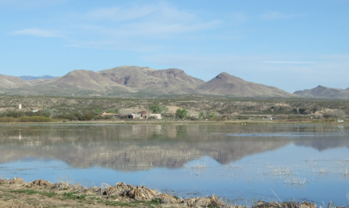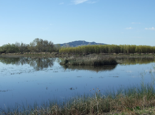 Decided to move on yesterday morning. Elephant Butte is lovely, but the showers are cold. Gently ambled north to Interstate 25, then exited onto narrow Route 1 just south of the Bosque del Apache National Wildlife Refuge on the Rio Grande. Drove a dozen miles into the Refuge and stopped at the Visitor's Center for information before continuing north to this little RV Park on the Refuge's northern edge. A sweet place, not fancy, but the shower is hot. The house and yard of it's elderly owner, widow Jaquina Trujillo, bounds the small RV park on former farmland. Then we drove the 15 miles north to the town of Socorro, did 3 loads of laundry, ate lunch, bought groceries, and came back here to enjoy the shade of Clemmie in the afternoon sun. Today, early, we drove the 4 miles back to the Refuge, loved the ease with which we unlocked and popped our bikes off the new bike rack, and then rode (stop, look,and go) round some of the open trails/roads. The wintering sandhill cranes have all left, and only a few snow geese remain, but the waters were loaded with ducks of all types. We lost our hearts and watched a movie that educated us about the amount of wetlands management effort it takes to make sure there's sufficient food for the hordes of birds that winter here and/or pass through on migration. The once-endangered wintering Sandhill Crane population alone has grown from just 17 in the early '80's to 12,000 today - each one of them consuming 3/4lb of corn daily. Talking with some volunteers (20-25 of them support the fulltime staff) it struck us that we might enjoy doing that too. Food for future thought.
