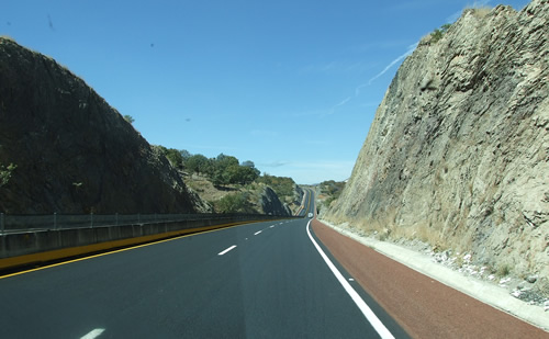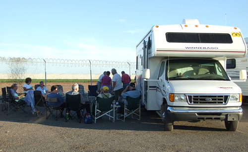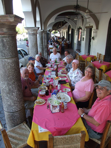 Left Mazatlan near 8:00 am. The campground has emptied out, winter residents preparing to return north and caravan season over. Boring and uneventful ride along mostly toll roads. Some good surface, some the usual potholes. Two posts along the way sprouted golden eagles. Pulled into this (supposedly secure) truck stop behind a large Pemex (gas station) at 3:30pm. 248 miles today. Many tractor trailers here and 3 other RVs. Place fenced in with razor wire atop. Adventure Caravans has arranged for us to have a security guard. Adjusted Clemmie to provide maximum shade - it's our turn to provide food for Happy Hour. Settled in for an early night. These travel days are wearing. Travel is slow due to caravan stops for potty breaks and to keep everyone tightly (too tight we thought) in line, toll booths, fuel stops, lunch stops, and topes or vibradores (speed bumps) in towns and villages, not to mention slowdowns on periodic poor road surface. If we average over 30mph we feel we're doing well.