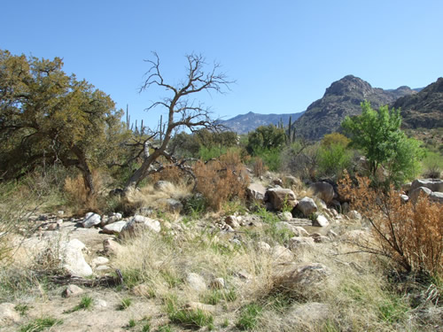 From our spot at Picacho Peak, traffic on distant I-10 patrolling like a sinister army cast unease over the campground. So we decided to leave and come to Catalina State Park to wait for our new bike rack to arrive in Tucson. Did so after breakfast on Wednesday morning a week ago. 37 miles. This place has more fabulous views, terrific birding, and outstanding hiking trails. No sooner had we settled in than the weather clouded over, cooled down, and said: it's time for spring rain. And rain it did on and off for 3 days, sometimes heavily. The desert soaked it up: Some flowers came out and the birds sounded happy. Then the sun came back though it's cool in the shade and chilly overnight. We rented a car for a bit and went shopping. Bill had 2 guitar lessons and visited Ron at his office twice for chiropractic treatment for his (Bill's) month-old pain-in-the-neck. Between that and a new pillow, his neck is recovering nicely.