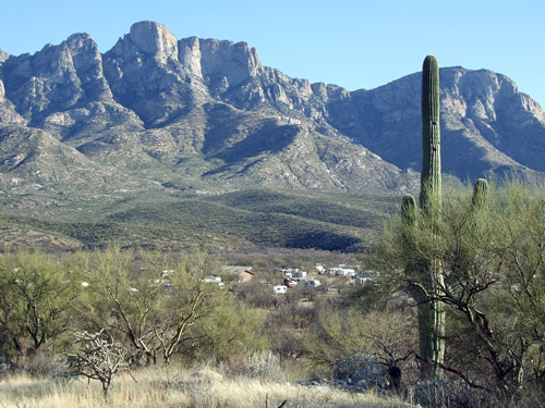 We woke up to a clear New Year morning at Caravan Oasis RV Park in Yuma. Up early (we lost an hour overnight as we came east from San Diego) for the all-but-final final leg of journey towards Mexico. East on I-8, not much traffic through the rocky mountain ridges and then scrubby desert to Gila Bend. Then past desert farm fields irrigated via a set of canals - looked like an endangered proposition to our undeducated eyes. Joined very busy I-10 and turned southeast towards the northern edge of Tucson and exited east to find this magnificent state park. Settled in under warm sun by 1:30pm. 225 miles. Quite a place.