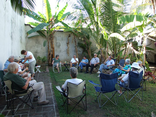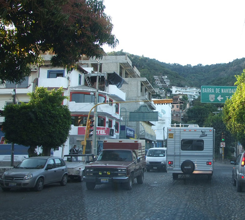 We left San Blas after breakfast on Sunday. The 85 mile drive to Puerto Vallarto was uneventual if slow. Pretty countryside and many towns and villages, all with "topes" (speed bumps) which are very effective at reducing speed to a slow crawl. It took about 4 hours, thankfully the road surface were good except for the last many blocks to reach this campground. These were of the now ubiquitous bumpy cobblestone. Puerto Vallasco is strongly tourist oriented, with cruise ships and high rise hotels and condos looming over the main road through town. Kind of like Miami beach with a mountain backdrop. [The "i" on webmaster's keyboard has decded to take a vacation, so please excuse periodc mis-spellngs.] Our campground is right in town sitting inside a walled-in city block. Excellent baños and showers. There's an Internet cafe as well as many little restaurants and shops right round the corner. We have good shade in our campsite from the palm trees and walls and the otherwise cramped campground has space for the now daily Happy Hours. On our morning trips to the baño, we strangely encounter a black, a white, and a grey rabbit who seem to share the campground with us. We're enjoying local street food, dried bananas, practising Spanish, and whatever else we can soak up of the Mexican culture. We've had two free days here and started work on a slide show for this trip. Today's birding foray started at 6:30am (pitch dark because we're now in Central Standard Time) so Pat punted. Doesn't seem to fit her morning routine, which needs time for the Kata and some yoga. Can it be that birding trips are beginning to feel like work? Tomorrow we leave for Boca Beach. Don't know when we'll have Internet access again.