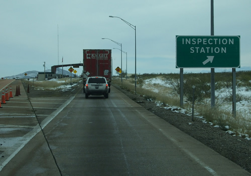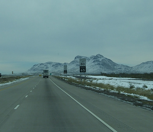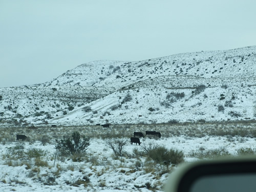 We left Albuquerque as soon as the sun had risen high enough to melt road frost, bring the air up to 22°F, and hint at warming Clemmie. Filled up the gas tank and south on I-25 towards Las Cruces. Not much traffic, good road. Scenery blurry behind the haze - seems like air pollution has spread everywhere, we can barely remember when we last had a clear mountain view. Poor humanity, payback time is not far round the corner. Near Las Cruces we joined I-10, and found the road lined with cow factories for mile after mile after mile. An astounding density of animals penned in and crowded round troughs, a strong odor of manure. Some of the poor beasts had hormone-swollen udders so large they could barely stagger to water, while others propped up their neighbors squeezed in at the hay trough. No wonder we don't eat beef anymore, and only organic milk. Having digested all this - we can only describe it as brutality - we followed the interstate through El Paso to its eastern edge, finding a tolerable overnight hook-up campsite here. 286 miles. We like that electric plug in cold weather, like a mother's teat. El Paso was much bigger than we expected, stretching 40 miles from end to end. Snow thick on the ground, out of place in the Texas desert.