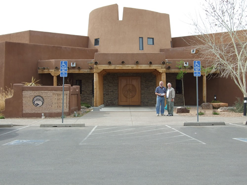 Thursday morning we drove the 4 short miles from the Bosque Birdwatchers RV Park south to the Visitor Center, and spent a couple of hours biking or walking round the marshes and enjoying the birds and ambience of the Refuge. Thereafter, drove leisurely north on I-25 towards Albuquerque. Once there we stopped to fill up the gas tank and buy some groceries before ensconcing ourselves in Steve's driveway. Last time we saw him was nearly 4 years ago, very pleasant to reconnect. Friday morning while Steve was at work we biked to visit Jim and Betty, friends from our Mexico trip. Only 4 miles, but some big hills - gave us (and our bikes) a workout. Betty and Jim introduced us to the 4 raptors they foster under the auspices of Hawks Aloft, an organization that cares for (and rehabilitates when possible) injured or abandoned hawks and owls. Birds which can't be released earn their keep by demonstrating in educational programs, raising abandoned fledglings, or serving as companion birds. We met: Nicky, a 12-year old kestrel that imprinted on humans as a nestling and can't be released because he doesn't know how to be a kestrel; Boo and Barney, a pair of Barn Owls with severely damaged wings; and Jamaica, an 18-yearold red-tailed hawk that was blinded in one eye and suffered wing damage when she was shot many years ago. Nicky and Jamaica have been cared for by Jim and Betty for over 10 years. Bless them! In the afternoon we visited the excellent informative Indian Pueblo Cultural Center and confronted our abysmal ignorance of Native American history. A visit to one or more of the remaining 19 pueblos will help ramp our knowledge level up a bit. Round dinner time, the National Weather Service issued a Winter Weather Advisory. Blistering cold and winds with snow and ice possible the next 48 hours. Bad weather lasted through Saturday afternoon, only snow flurries with no accumulation though we heard I-25 north of here was closed. Clemmie once again proved her snug worth against the elements. We took a fast walk along one of the many nearby trails into the hills each day. Webmaster spent time creating more route maps of our travels and slide shows, and has finally got back on track with her writing project.