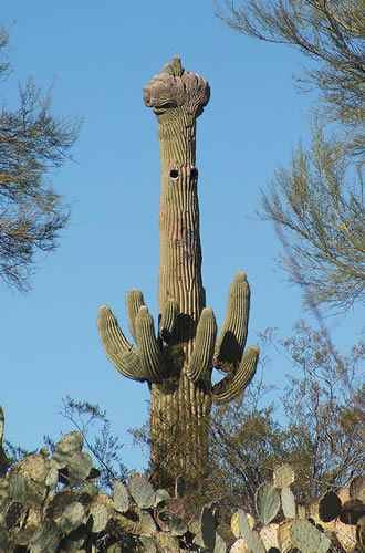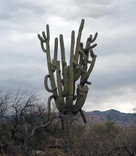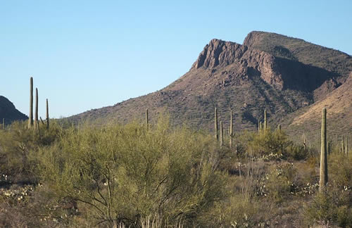 On Thursday John and Heather took us to the Arizona-Sonoma Desert Museum on the edge of the Saguaro National Monument west of Tucson. A great place, spent the day walking round learning about desert landscape and critters. The Museum also functions as part zoo, to educate and preserve desert wildlife. There, among other birds and animals, we saw a pair of the only 50 remaining Mexican Wolves (Lobo wolf), which the museum has rescued from imminent extinction through its breeding/release program. We hosted John and Heather for dinner on Clemmie after, with time beforehand to sit out bird- and mountain-watching before the sun went down and the cold set in. Great thing about RV'ing is the fabulous front yards we have, with no yard work. Not much housework either. Friday, we went on an early 2-hour bird walk through Catalina State Park with a local naturalist. Thereafter, we turned Clemmie into a car and went hunting for a second camera, since our current one is exhibiting intermittent attitude attacks (the automatic focus won't.) Decided to upgrade with a camera that has manual focus and zoom in addition to automatic. After driving hither and yonder in search of a discount, we finally ended up at Tucson Mall in Ritz Camera. Better prices (and expertise) than the discount stores. Lesson: forget the "discount" and go for a quality camera store. That having used up much of the day, we filled up with propane and provisioned before returning to our campground - to find John and Heather waiting to ferry us to Jane and Ron's for dinner and hot tub. It's been great to see them all.