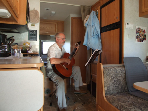Music seems to be our gig these days and we're loving it. Bought a new stool and music stand for our guitar player. Visited a bunch of music stores and spent money. Moved the music room aft - gives our guitar player more space to practice and lets Pat roam around while he's at it. We love our small home and these occasional new arrangements bring huge pleasure. Meanwhile Pat has got off on the new alto recorder she bought at The Folk Shop (great place.) She read 2 books about iPods and iTunes, downloaded iTunes and organized all her bird song CDs, and some of her favorite classical music, on her laptop. iPod purchase deferred until we recover from the new bike rack, bikes, and recorder. Last Sunday we went for a canyon hike with Ron, Jane and Josh (it was Jane's birthday) and afterwards out to lunch with them. Jane and Josh came for dinner on Wednesday, after we picked up our bikes and new rack at Fair Wheel Bikes. The Thule T-2 rack is awesome, incredibly more convenient than our old one. Works just like the ones that go on the front of buses. We did some cleaning out and paid two visits to the Goodwill to recycle un-needed items. Filled up with groceries at the Tucson Co-op. Made more granola and better-than-butter. Rode our bikes and hiked on the park trails. We're happy campers!