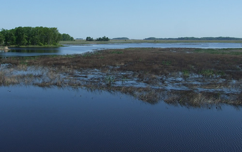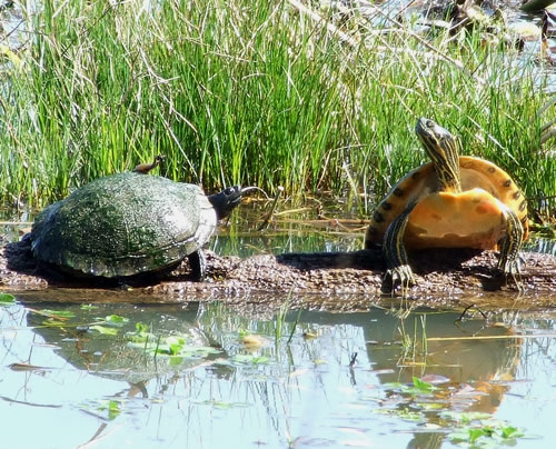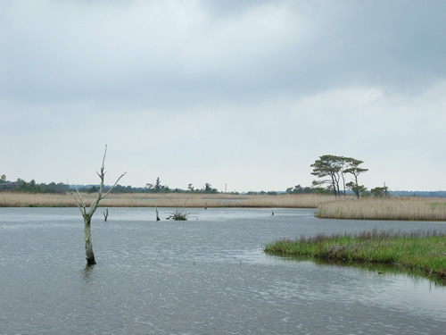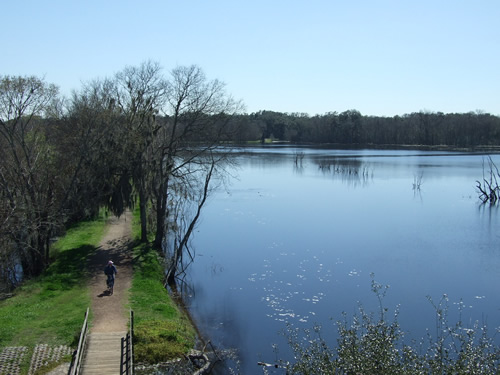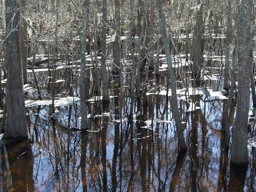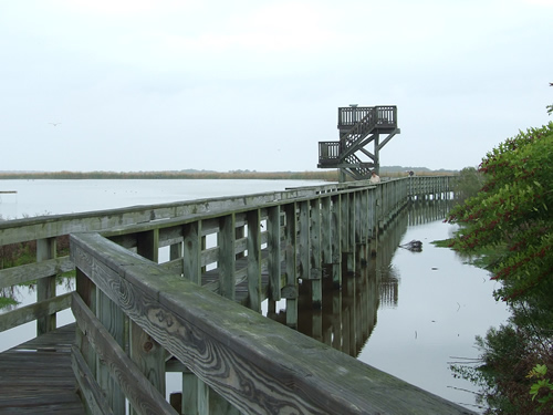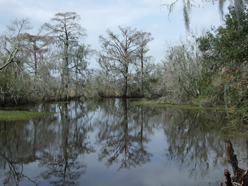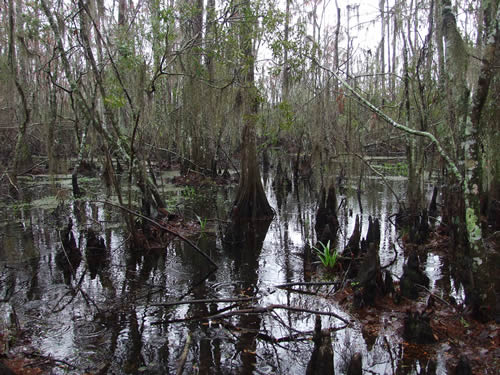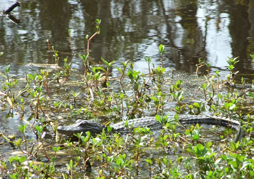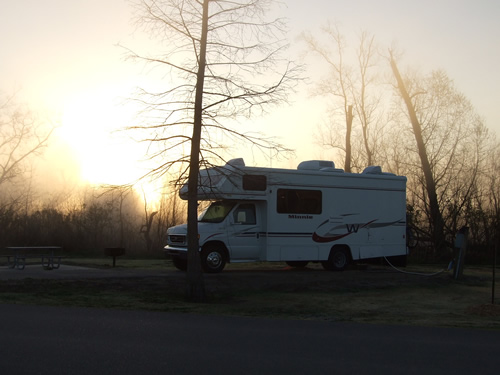 We drove across the Mississippi early Saturday morning into downtown New Orleans, where we picked up I-10 going east. On its way to the Lake Ponchartrain causeway, the interstate cuts through the middle of the upper Ninth Ward. Those views will be etched in our minds for ever. Abandoned apartment complex after abandoned apartment complex. Subdivisions with a few cars in the driveways of a few rehabilitated houses, neighboring houses vacant and decaying. Miles and miles of it. Misery in the air, palpable. Through Mississippi and Alabama into the Florida panhandle. The sun came out as we arrived in the Sunshine State (FL) and helped us disconnect from the ravages we'd seen. Then near the little town of Sneads to this small State Park nestled on the shore of Lake Seminole, created by the Jim Woodruff Dam. 357 miles. The Chattahoochee and Flint Rivers flow into the Lake, which drains into the Gulf through the Apalachicola River. We're (literally) on the eastern edge of the Central Time Zone here (we entered it at El Paso, 1,000 miles back) and the sun rises early. It's a lovely, laid back spot, filled with bird noises and marshes busy with turtles.
