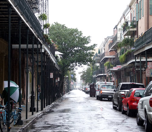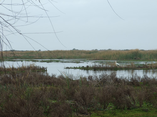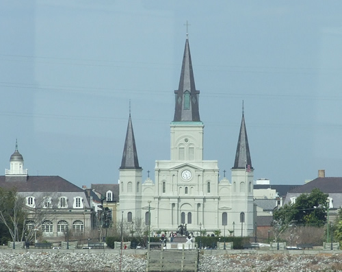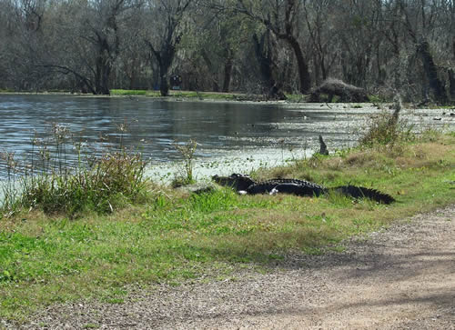 We left Houston early Monday morning, a dazzling sun right in our eyes as we fit in with the heavily trafficked I-610 going east. Then I-10, rattle and bump, to the Louisiana border. At the LA welcome center, the docent suggested we take Rte 90 to New Orleans, swinging south through the swamps, rather than busy I-10. Dreadful road surface, stop lights, through Lafayette and south for 30 miles, then improved dramatically. Many of the southern parts of this route are elevated above the swamps of the disappearing Delta, filled with cypress trees. Arrived here around 4pm, 365 miles. This handy state park is about 4 miles south of New Orleans, across the Mississippi. It's been rebuilt since Katrina (signs of devastation still showing in the undergrowth and broken trees.) Unexpected gifts: free but slow WiFi and free but slow laundry! Tuesday morning watched a gorgeous misty sunrise break the day. Earlier, too. We're gaining some easting. Wednesday we rented a car and drove to Algiers Point to take the ferry across the River. Spent the day in New Orleans, passing historic buildings, eating beignets in the French Market, found the Jean Lafitte National Historic Park headquarters, and followed a ranger on a guided wet walk through the French Quarter. Then we found the New Orleans Jazz National Historic Park, a segment of John Lafitte NHP, and lucked out - enjoyed a free 1-hour concert by jazz pianist John Royen. Rain started in the afternoon and continued through the night, heavy downpour in the morning. Wrapped in rain gear we drove to the Barataria Preserve (another segment of the NHP) for a nature hit. Thankfully the rain dried out, and we spent over an hour watching birds and alligators as we hiked along boardwalks beside swamp, marsh, and bayou. Later, we drove further into the Delta to the village of Jean Lafitte and ate gumbo for lunch. Signs of hurricane and flood damage widely evident everywhere.