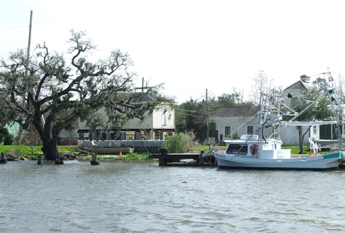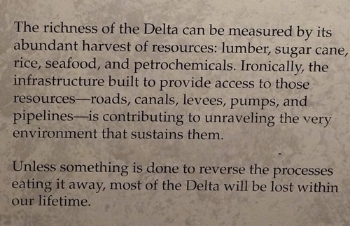 A few interesting things we learned about the Delta: This whole area of southern Louisiana between Texas and Mississippi was once a shallow bay. In less than 5,000 years, the Mississippi, draining 40% of the US and discharging 450,000 cubic feet of water per second into the Gulf, dumped millions of tons of sediment along its path and filled in an embayment that once reached to Cairo, Illinois. This 20,000 square miles of new land is the Mississippi Delta, where 1/3 of the nation's seafood is now harvested. The bounty of this vulnerable land (lumber, cane, rice, seafood, petrochemicals, and transportation access) drew population growth, and rapid development. Canals, levees, port facilities, refineries, concrete, roads, buildings, pumps, pipelines, and introduced species have now utterly destroyed the natural drainage system. For nearly 300 years, human efforts to tame and harness the river slowly starved of the Delta, destroying the river's ability to create new land to match that which washed away. The infrastructure built to access the area's abundant resources is rapidly destroying those very same riches. The golden egg is gobbling up the goose. Absent a huge coordinated effort, it is estimated that the Delta will disappear in our lifetime. The coast lost 2,000 square miles of land in the last half of the 20th century, retreating inland 20 miles in the last decade alone. The first line of defense against hurricanes, and an incredible human and natural resource, is gone (it seems) for ever.