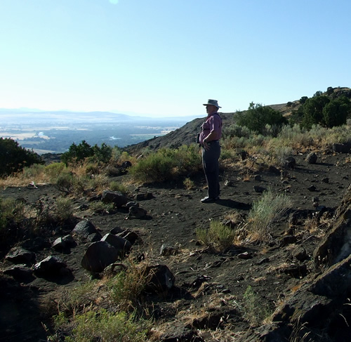 Saturday evening we went to the ball game (the Idaho Falls Chukars are an A-league farm team for the Kansas City Royals.) Fun. Yesterday morning we drove north about 20 miles across flat Idaho farmlands to the foot of the Menan Buttes, then hiked up the side of the North butte. These interesting geological formations have been designated as National Natural Landmarks, extinct volcanoes formed by violent eruptions 10,000 years ago. These rock formations erupted through the cold waters of the Snake River - and when the molten magma met the cold river water it cooled so quickly crystals were unable to form so the lava solidified into tachylite (a glass). The heat of the magma flashed the river water to steam, shattering the glass into tiny fragments that welded together as the hot ash settled to the ground. The Menan Buttes are the only volcanic eruptions in fresh water in the United States. The soil over the rock of the butte was very sandy and dry. Craig gave us an interesting lesson in tracking; we missed out turn to descend the Butte, so he backtracked until he found our particular footprints leading up from the path of our ascent. Learned how easy it is to adjust one's mental map to conform with where one thinks one is. Gained some insight into how we reconstruct our memories to fit where we think we were. Interesting... Explains why witnesses sometimes mislead.
