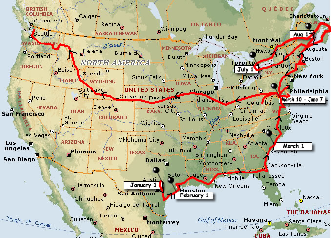 The map to the left shows our travels unfolding during 2008. Our route is shown in red. Our location at the beginning of each month is marked with a push pin and date. Click on a date to read the log entry for that period.